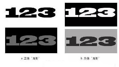 按照印品圖文的正負(fù)像,“鬼影”又可分為正像“鬼影”和負(fù)像“鬼影”。印品本身圖案顏色較深的部分稱為正像,在其圓周方向的外延形成相比正像顏色較淺的“影子”,即所謂的正像“鬼影”,如圖1a所示;印品本身圖案顏色較淺的部分稱為負(fù)像,在其圓周方向的外延形成的相比負(fù)像顏色較深的“影子”,即所謂的負(fù)像“鬼影”,如圖1b所示。
